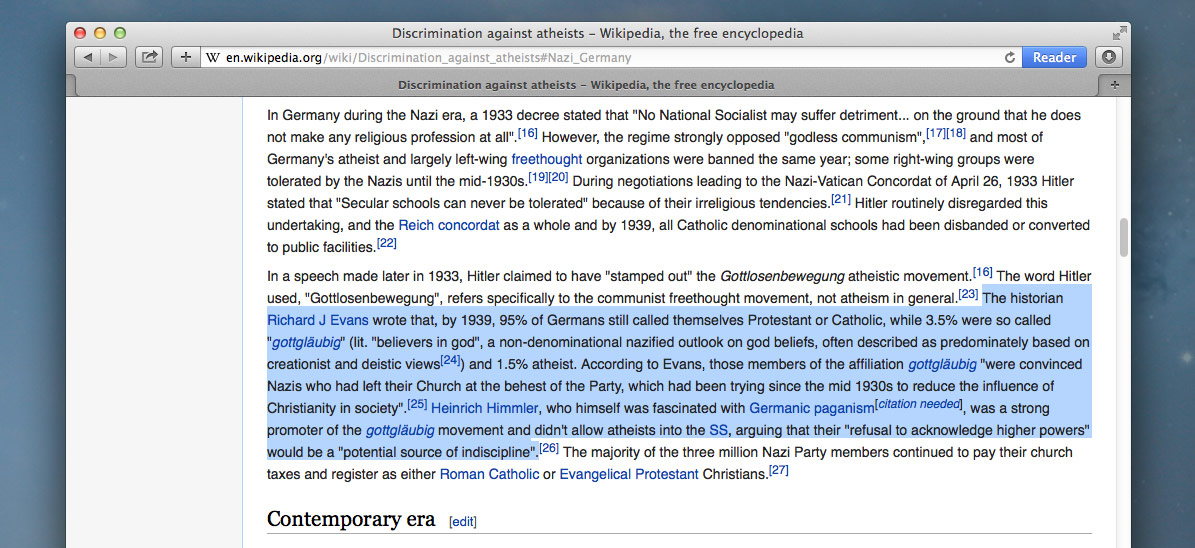 CONTENT REMOVED the law courts (which openly acknowledge deriving their ideals and values from the same book that guided Hitler, the Bible) see it as their role to preserve the Christian basis of the laws of the land (as the before-mentioned Paton wrote) they rule on. THE FABLE OF AN ATHEIST HITLER Various Christian bodies have exercised a deliberate misinformation campaign which proclaims Hitler to be an atheist, so that the views of Christians are not examined and are not tainted by being shown to have been the basis for Hitler's hatred that led to his committing atrocities. A result of Christian propaganda is that atheists have had to defend themselves against consistent and relentless Christian charges that they are "like Hitler", while Christianity, the ideology that guided Hitler is promoted as anti-Hitlerian.